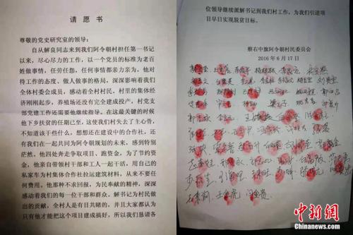 2016年6月17日,星包養軟體期五。談起那一天,解良甚至不需要刻意回憶。那天,阿令朝村兩委和察右中旗組織部的干部,來到了解良工作的區黨委黨史研究室,請求他回到阿令朝工作。當時,村里還帶來了一樣東西——上面有57個鮮紅手印的《請愿書》。