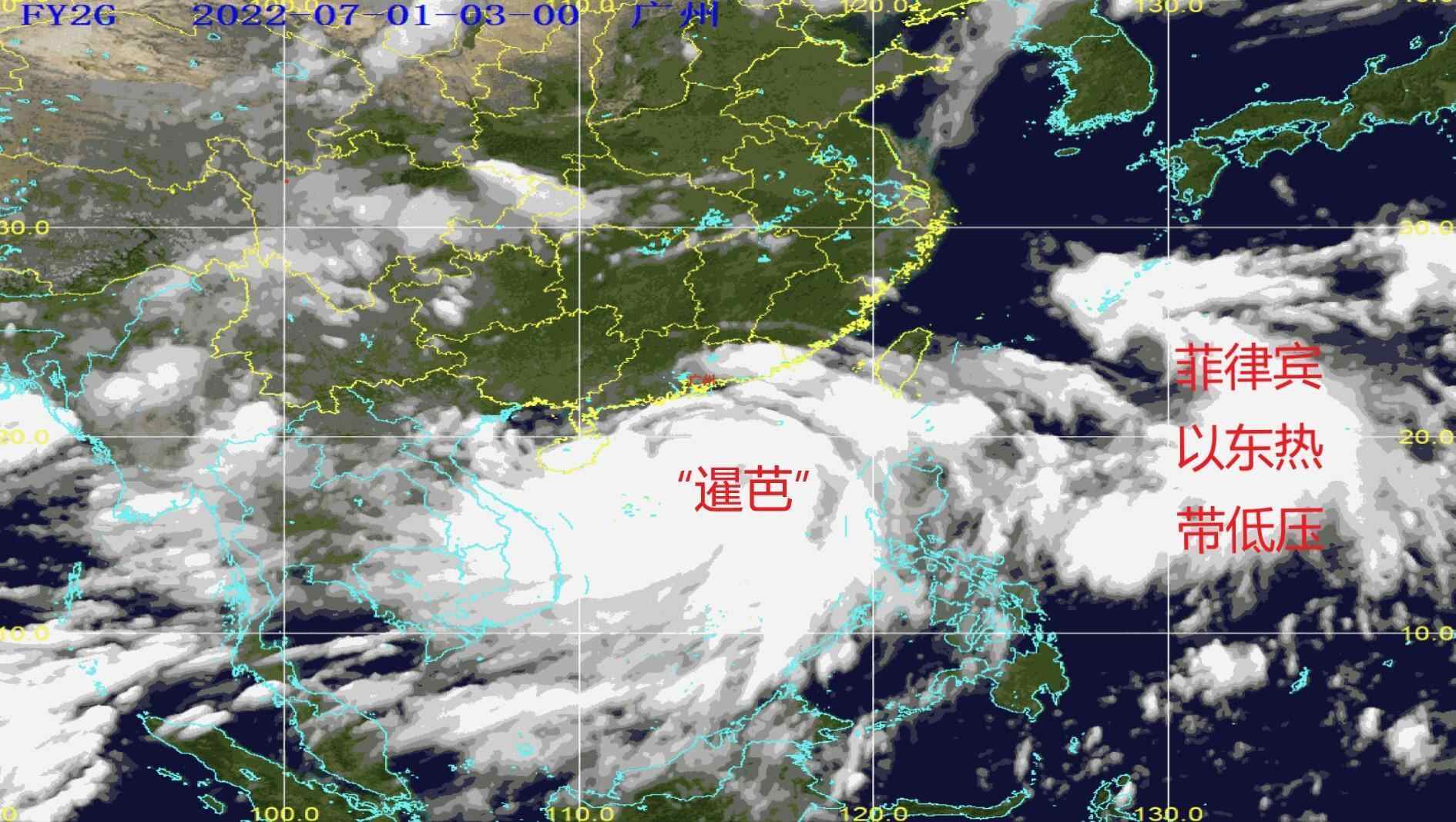 7月1日11時“暹芭”與菲律賓以東寒帶高壓衛星圖像 廣州市景象臺風云2G衛星圖像 梁懌韜標注